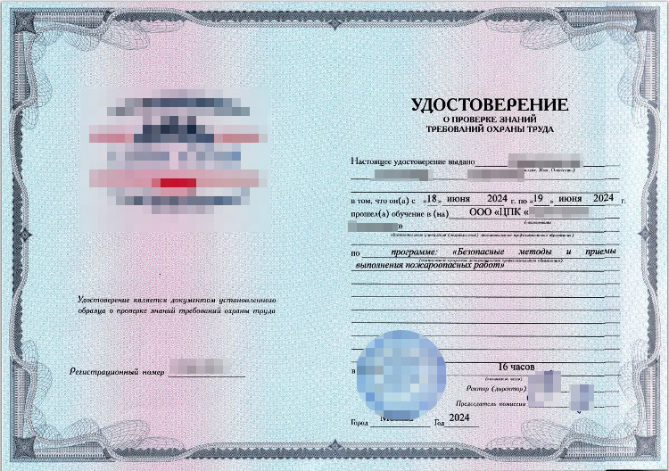 Образец удостоверения «Безопасные методы и приемы выполнения пожароопасных работ».
